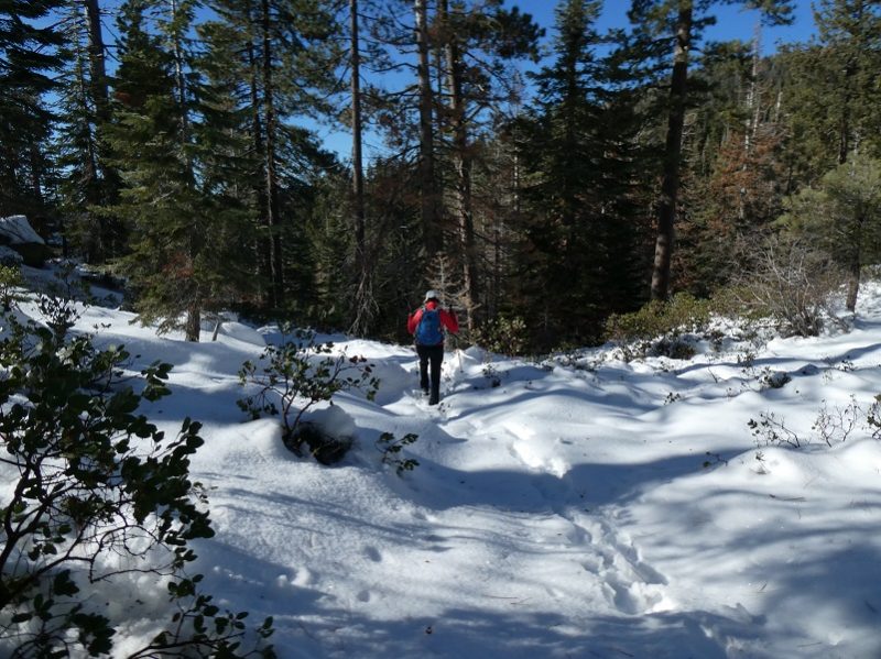 This is my favorite time of year to hike up to Chilnualna Falls, when a little snow has fallen and the creek is decorated with ice. The hike has a lot of “up” in it, one reason that I like to pick a cool day to do it. After reaching Chilnualna Falls, we headed upstream a bit to a very pretty lunch spot where the icy creek was lined with pristine snow.