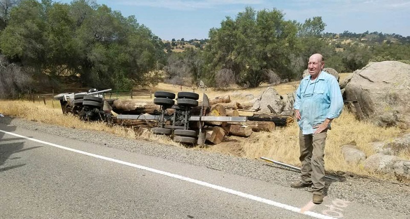 Terry Jacobs, driving for Willis Logging Company of North Fork, had picked up a load on Sky Ranch Road (Road 632) near Calvin Crest this morning, and was headed to Madera.