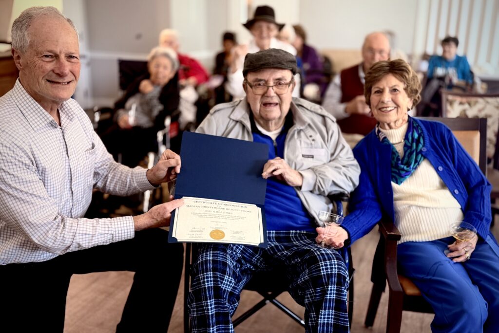 Home/Madera County Couple Celebrates Historic 80th Wedding Anniversary Milestone/BILL AND BREA PROCLAMATION PHOTO BILL AND BREA PROCLAMATION PHOTO Bill & Bea Jones celebrate 80 years of marriage with Supervisor Poythress.