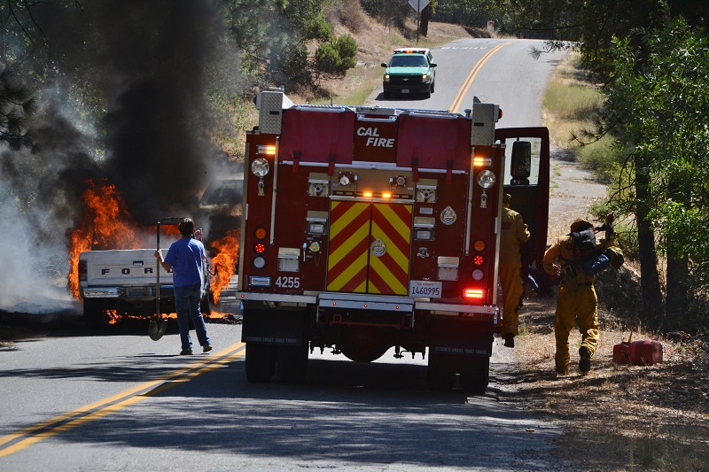 Cal Fire Engine 4255 was first on scene, and quickly got the vehicle fire extinguished. Engine 4260 also responded, along with a Mt. Bullion crew, made up of firefighters who had not been sent out on strike teams to other fires across the state. They did mop-up and made sure the fire was dead out.