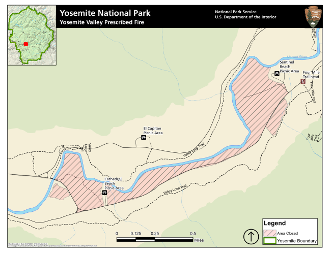 Sections in the prescribed burn remain active and in order to maintain safety of visitors, the Valley Loop Trail segment within the burn area between Cathedral Beach and El Capitan Cross is closed to all travel (with the exception of roads and parking areas within the Sentinel Beach and Cathedral Beach areas).